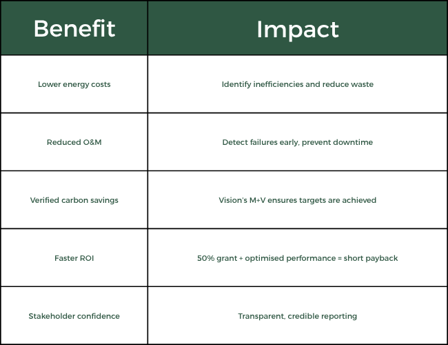 By pairing the EM&T-funded meters with Vision, organisations ensure they are not just installing energy smart meters but also embedding a system that verifies, validates and maximises the return on investment.