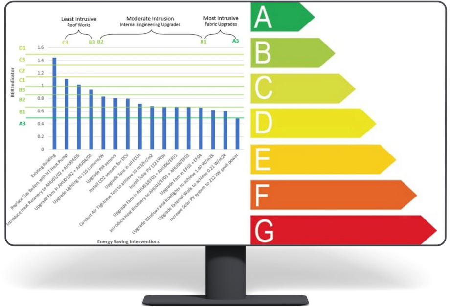 Lawler Sustainability have developed an in-house algorithm which strategically outlines a pathway to achieve a desired BER. This algorithm can be tailored to suit your needs such as prioritising cost/benefit analysis over carbon savings, or potential levels of occupant disruption to intervention payback periods and implementation timescales. We have a team of energy modellers and engineers who are well experienced in delivering BER pathways based on Client’s needs and goals. We understand that not every building is the same and will require specific attention to determine practical solutions.