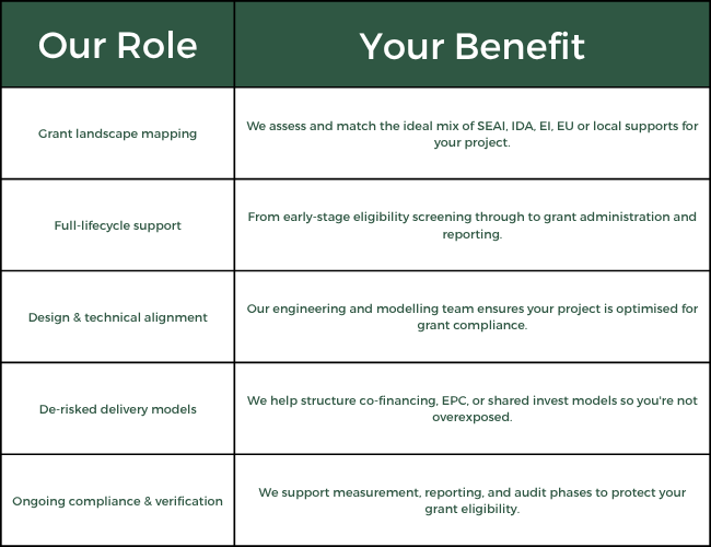 We prepare grant applications, handle interactions with agencies (SEAI, IDA, Enterprise Ireland, etc.), and refine your submission to maximize your success potential.